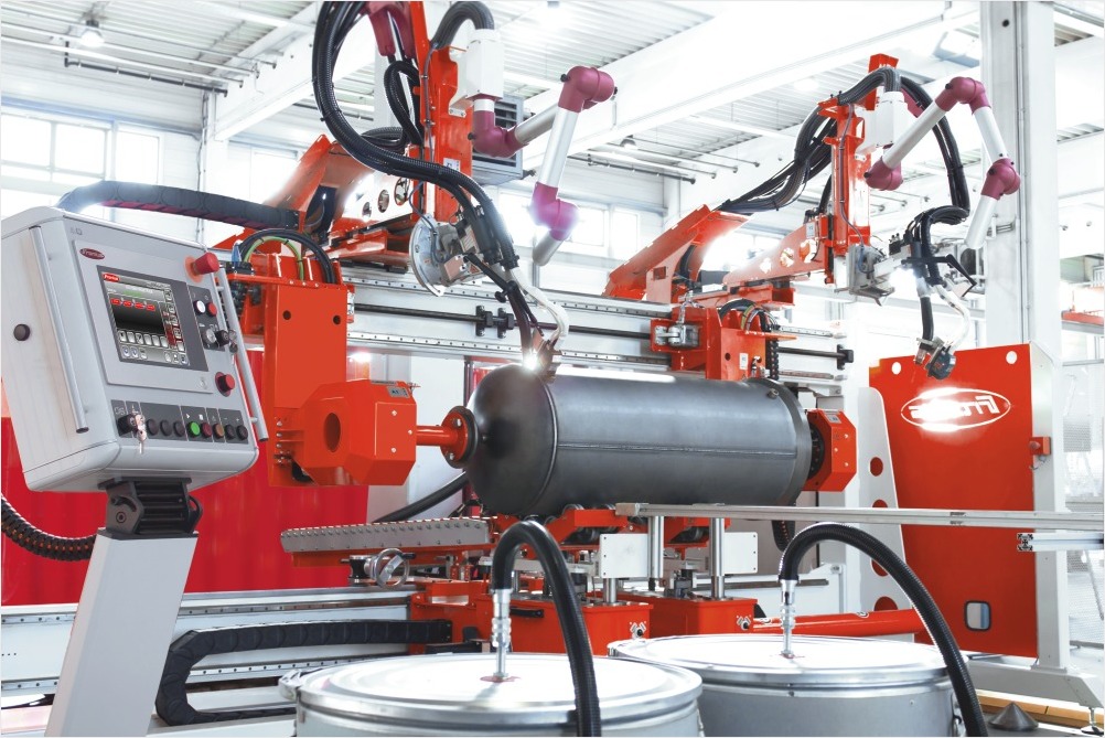 technologIASistema de soldadura circunferencial mecanizado con dos cabezales de soldadura CMT Twin y controlador de sistema HMI-T10 para la soldadura simultánea de conchas de contenedores a bases.